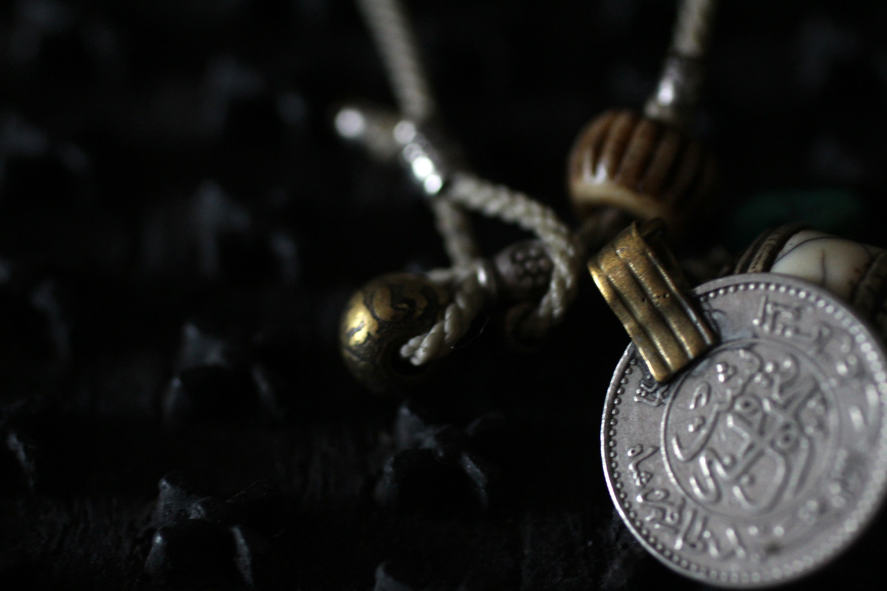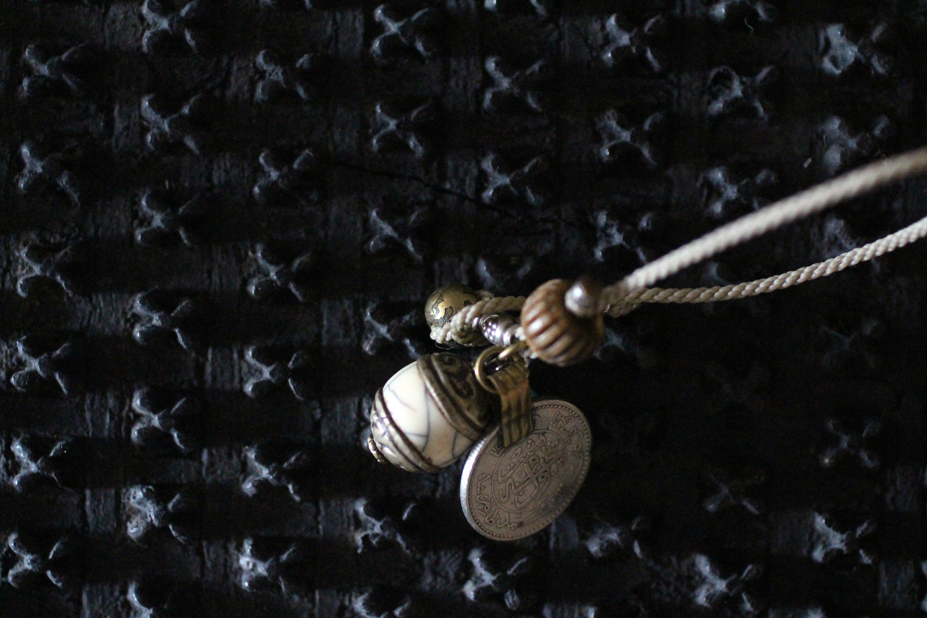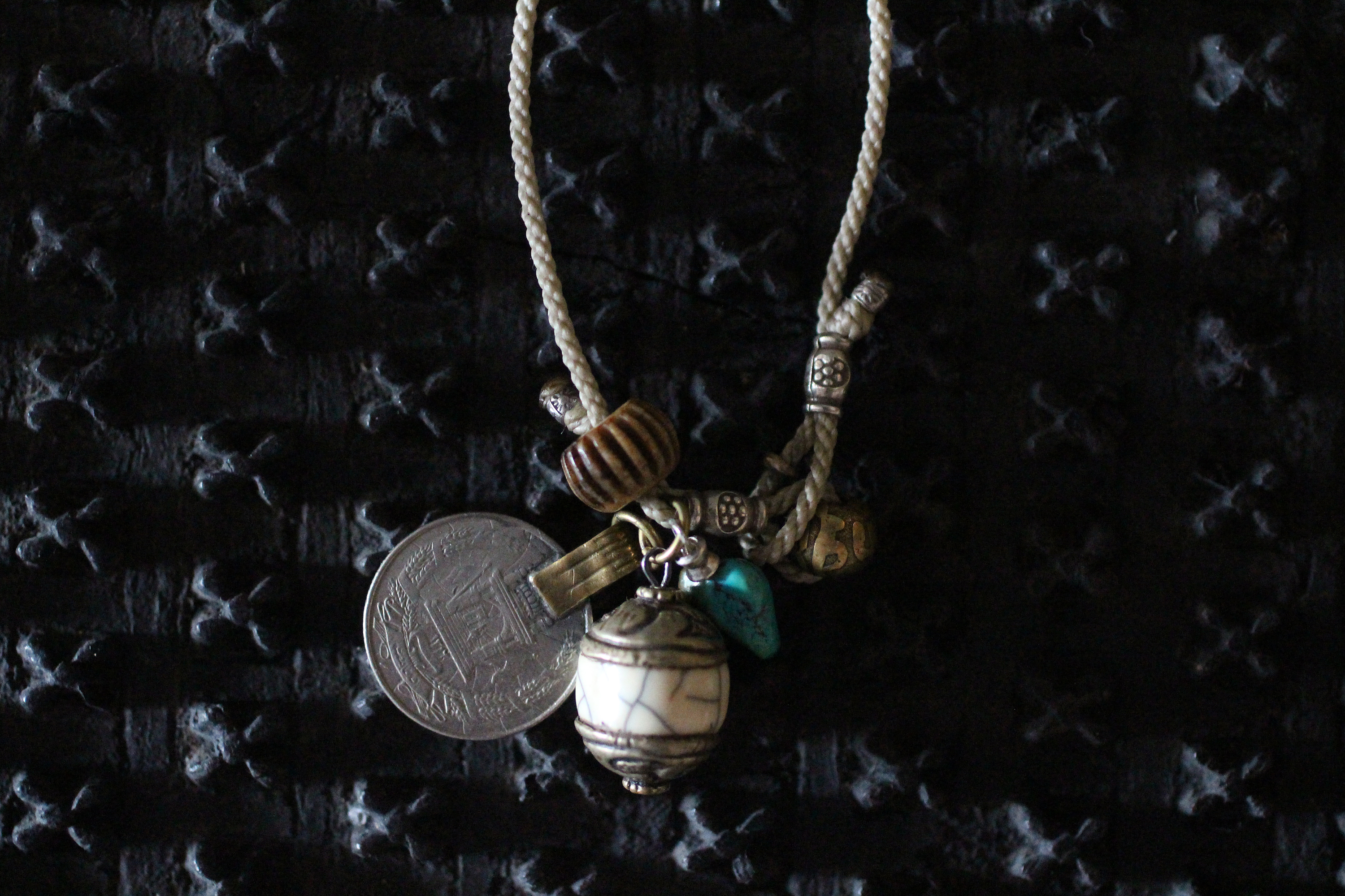 装飾したアフガニスタンのハウライトと、アメリカのスリーピングビューティターコイズ、パキスタンコイン、チベットの真鍮ボール、タイのシルバー、ネパールのウッドビーズ。