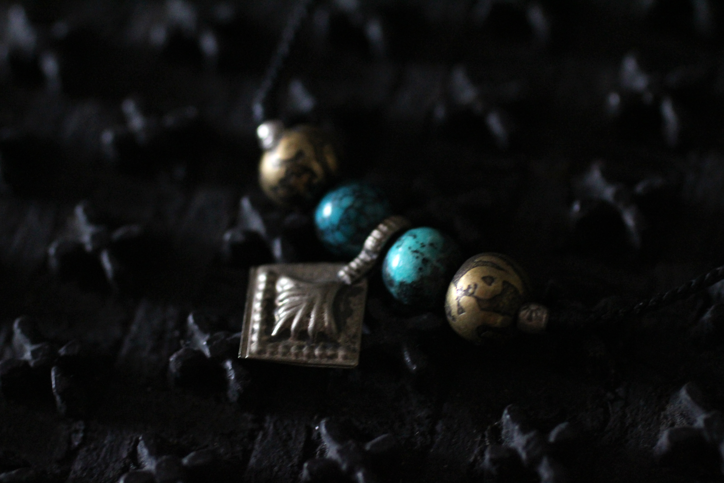 アフガニスタンの3m近くあるオーナメントを1つ1つ外して中央に。両隣にチベタンターコイズと同真鍮ボール、タイのシルバー。