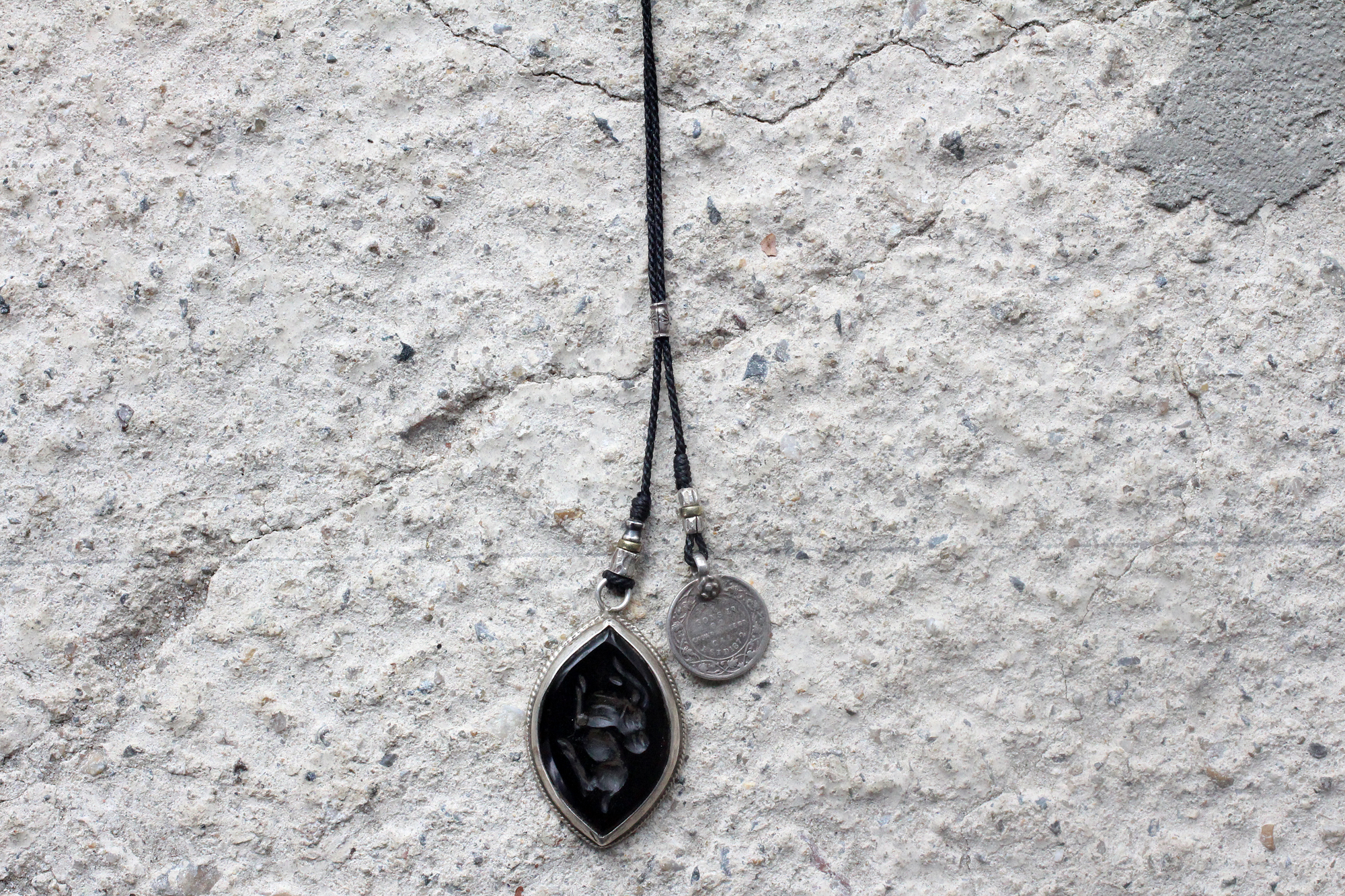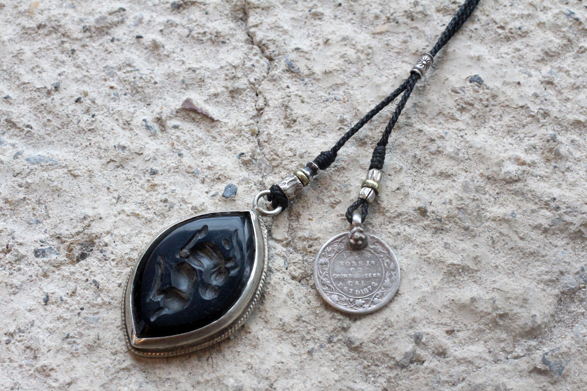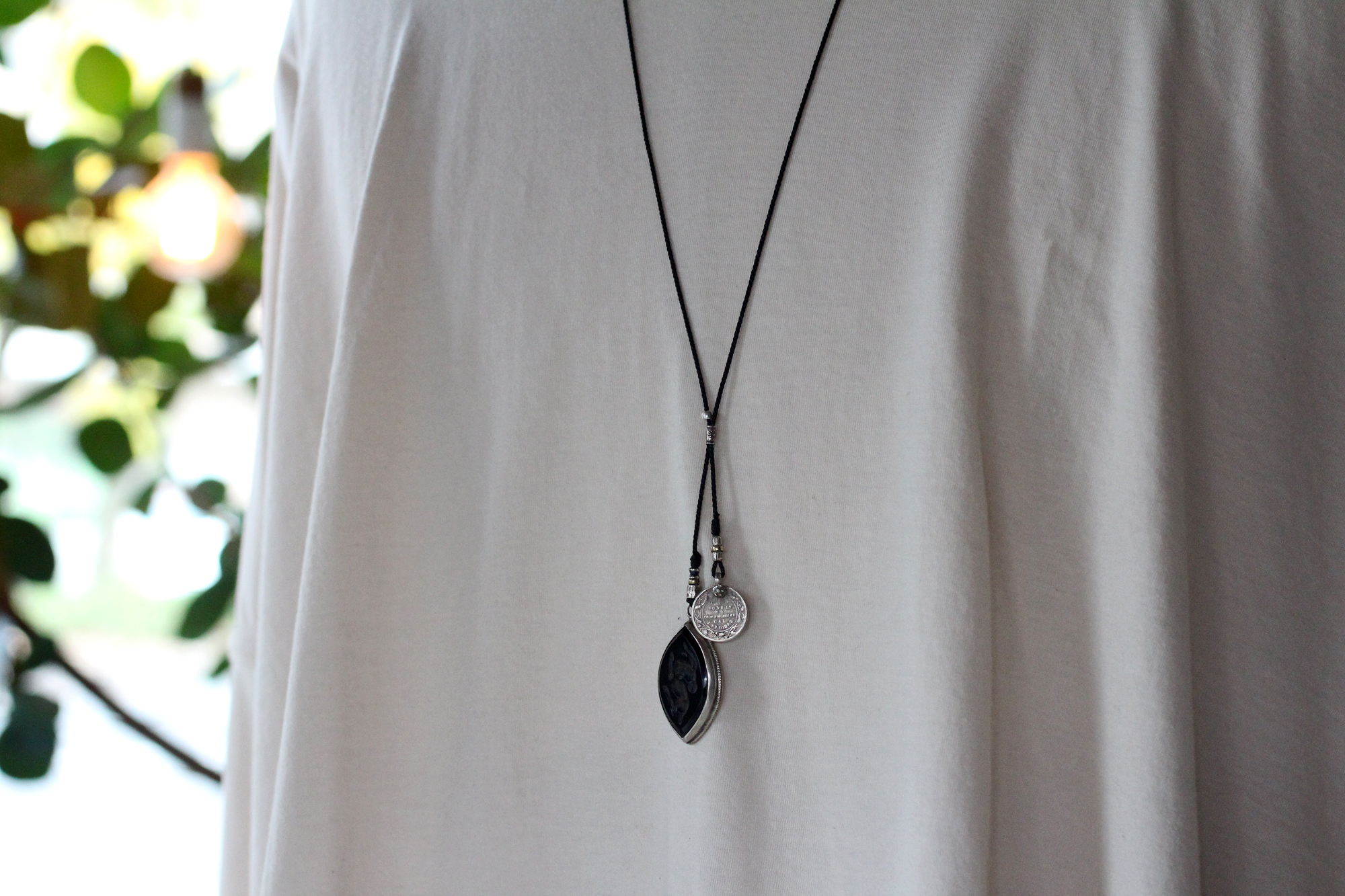 もう片方にはシンプルにインドコインのみを繋げました。シンプルなネックレスですが存在感あるインタリオがより際立つデザインです。