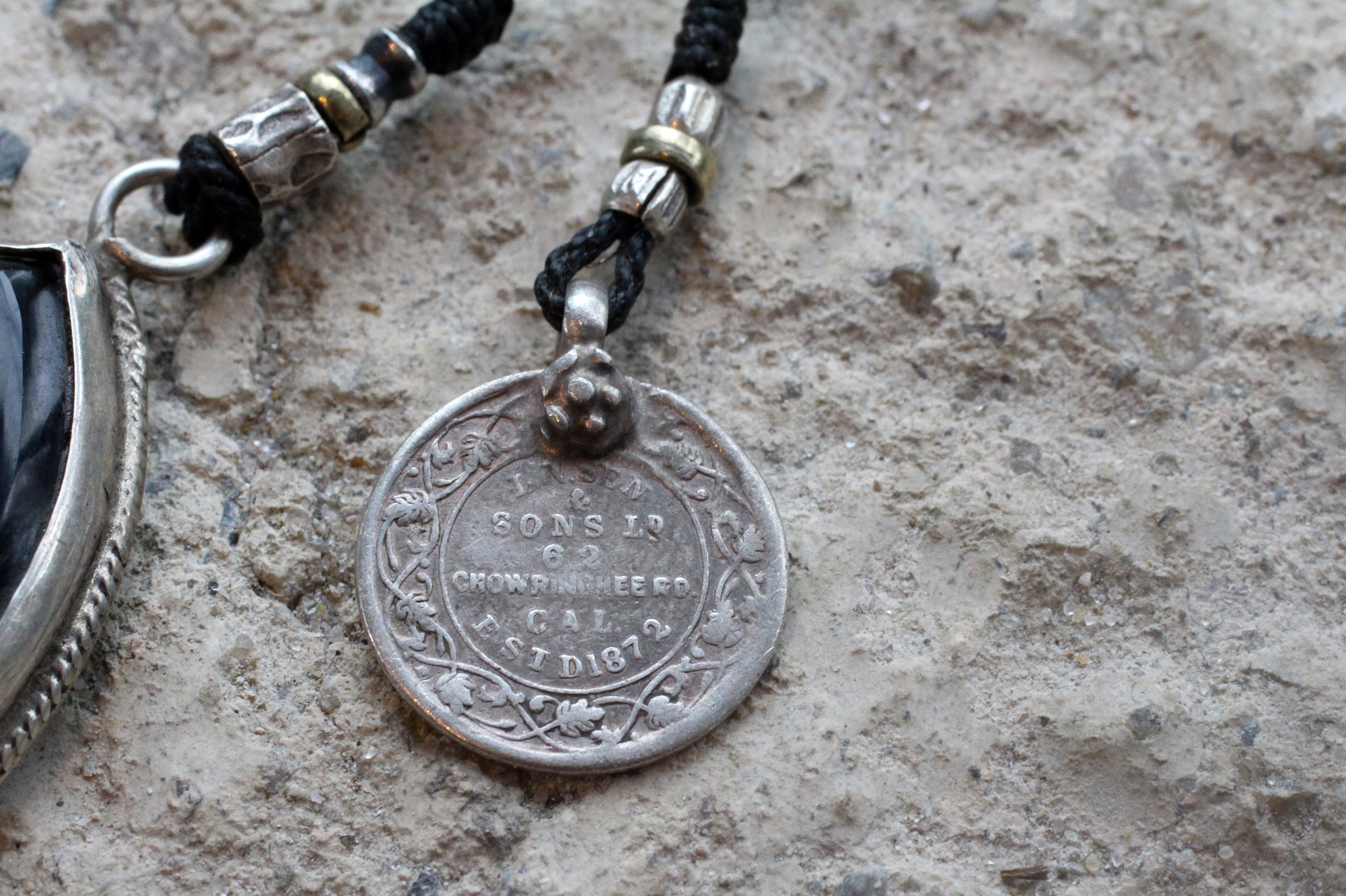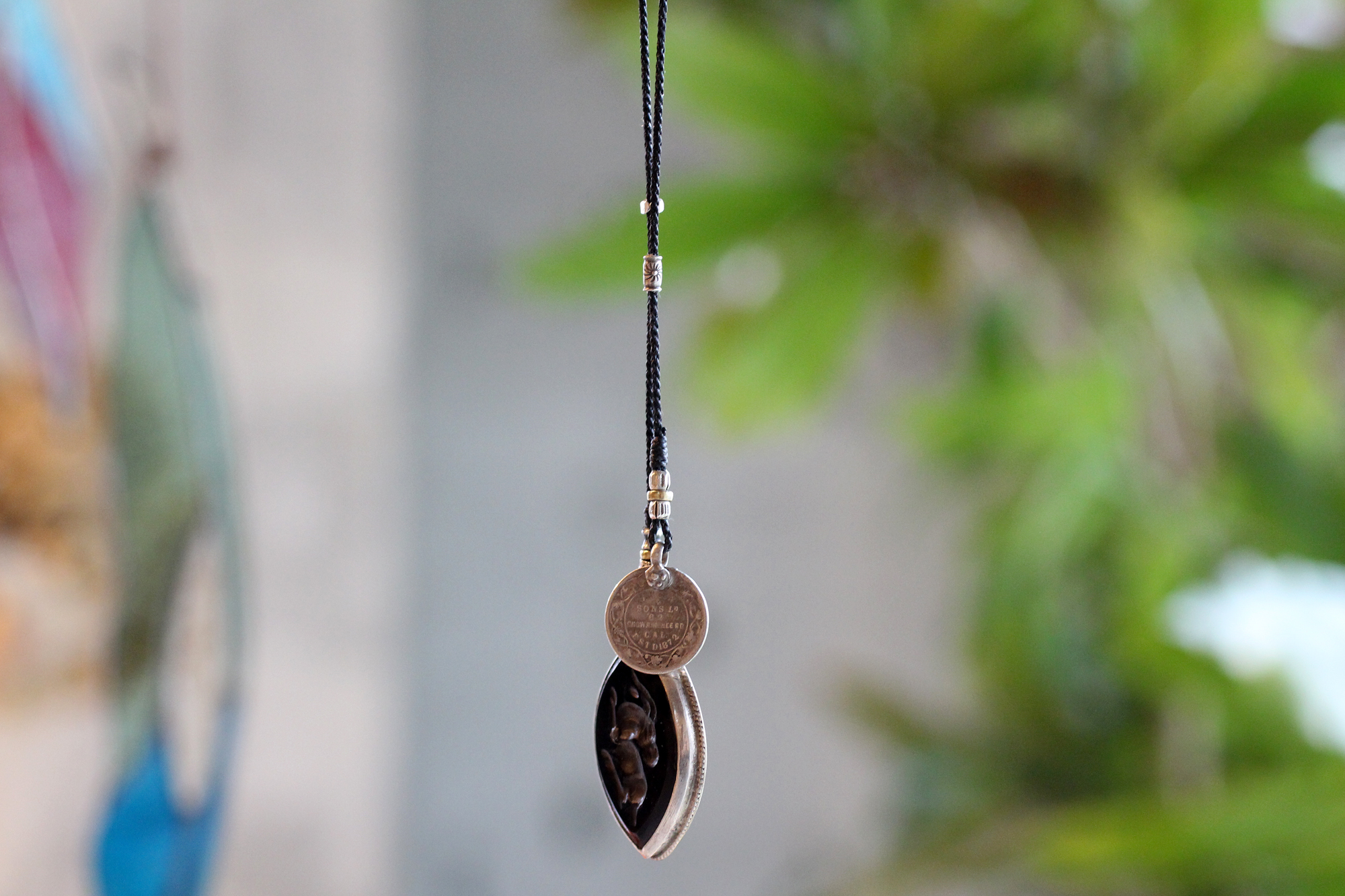 今回はインタリオの中でもモチーフとされる事が多い動物の模様が彫られたアゲートを、シルバー枠でペンダントトップにされていた物を使用しています。生産はパキスタンかアフガニスタンとの事でした。