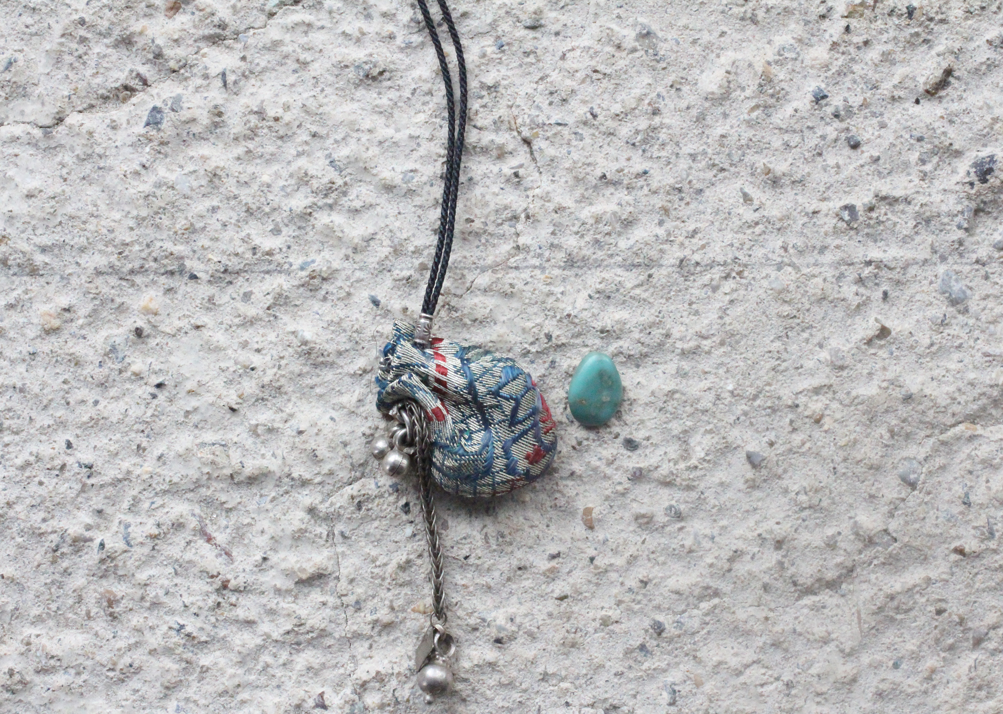 西インド、ラジャスタン州の砂漠都市、ジャイサルメールのアンティークディーラーから購入した小さなトライバル(部族)のシルバーパーツに、Afghanistanのシルバーベルを。