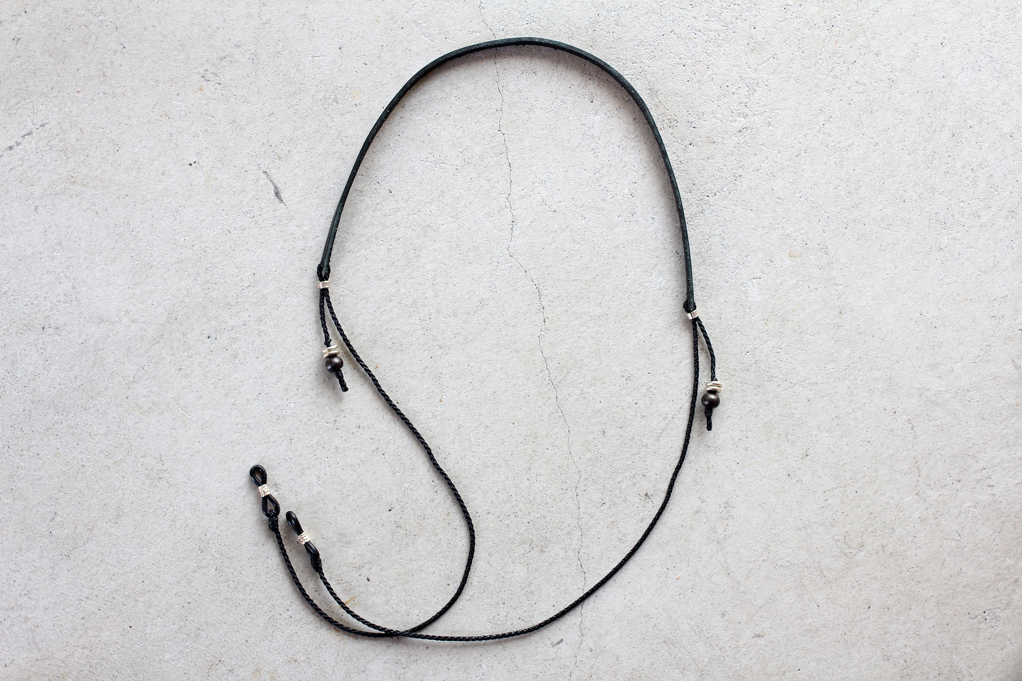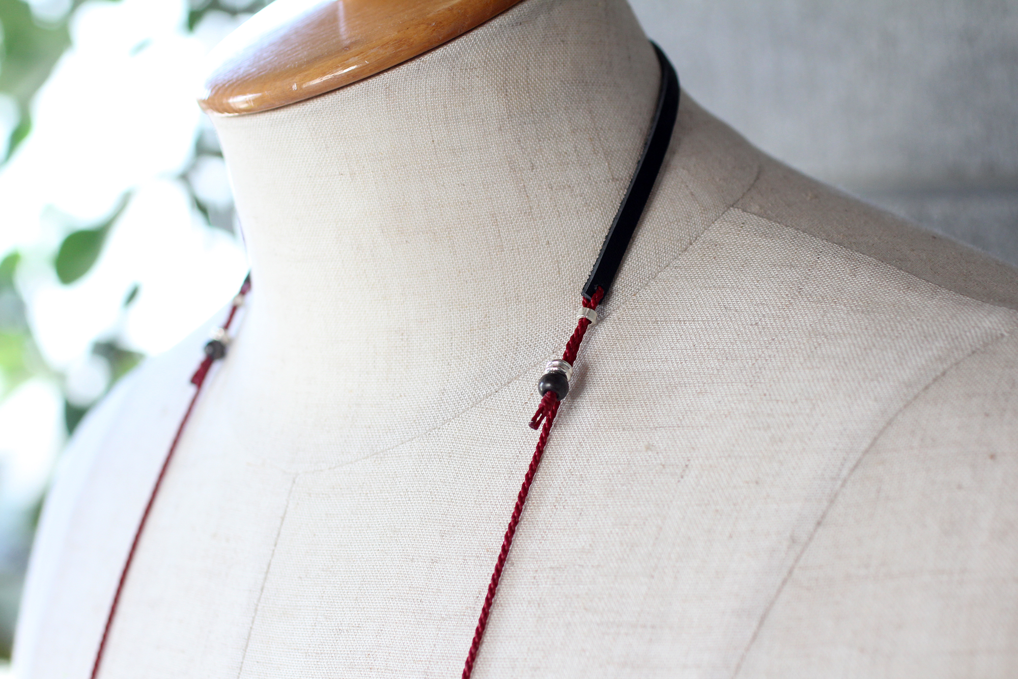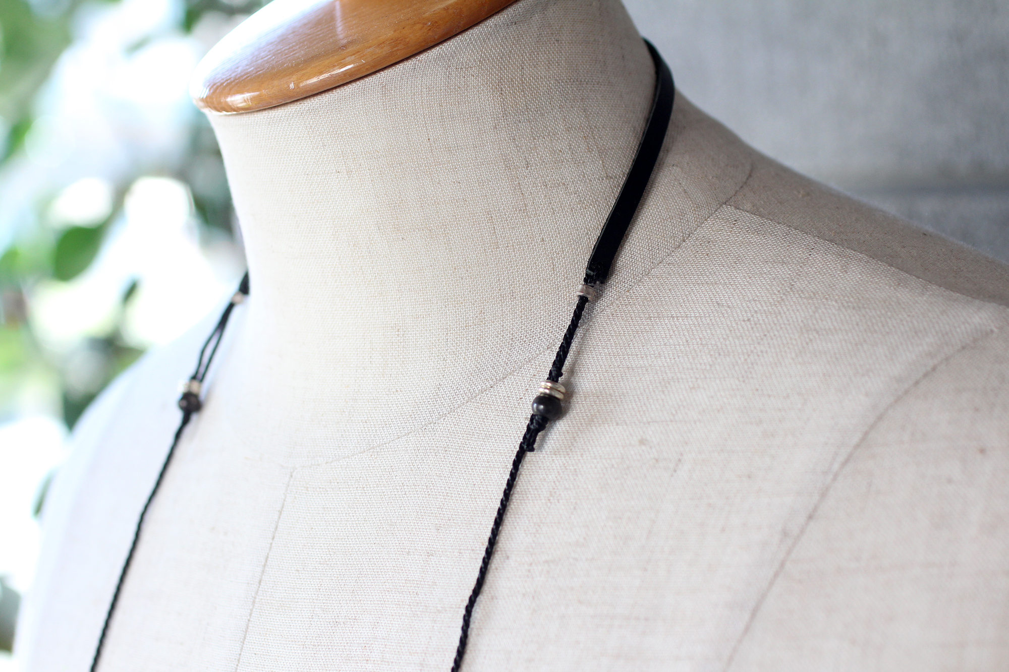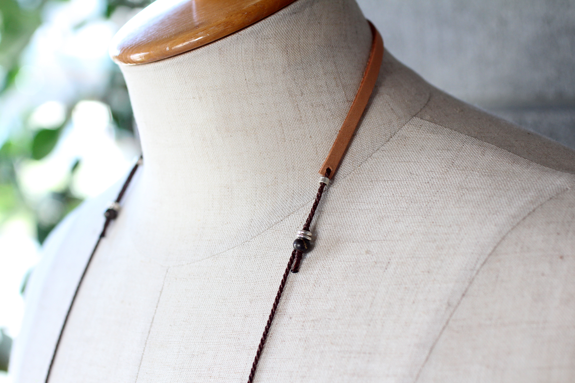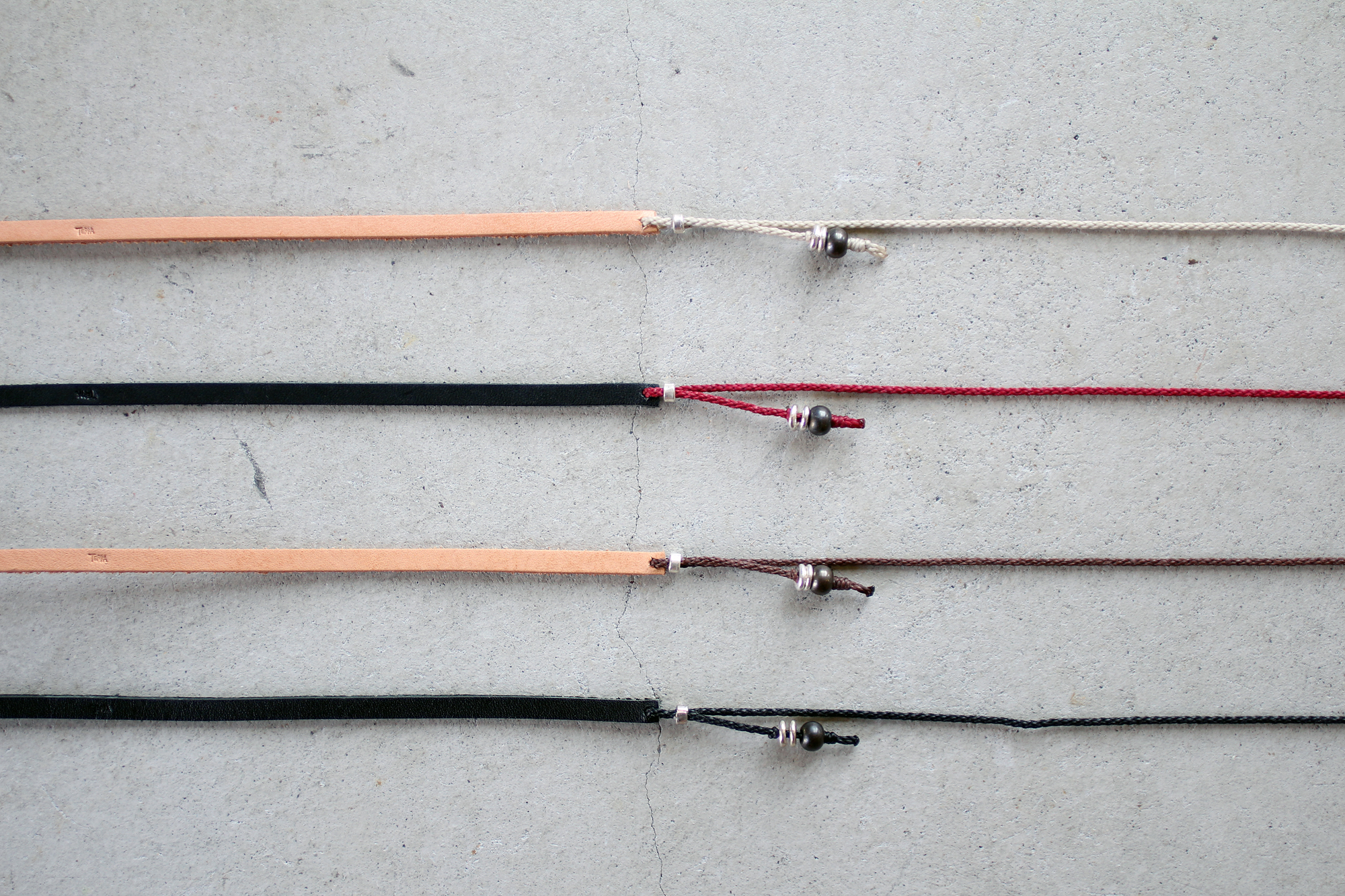 牛ヌメ革のナチュラルとブラックの3㎜幅のレザーコードは、首回りをシンプルに見せ為なえるべく細く、かつしっかりとしたホールド感を感じる幅にしています。