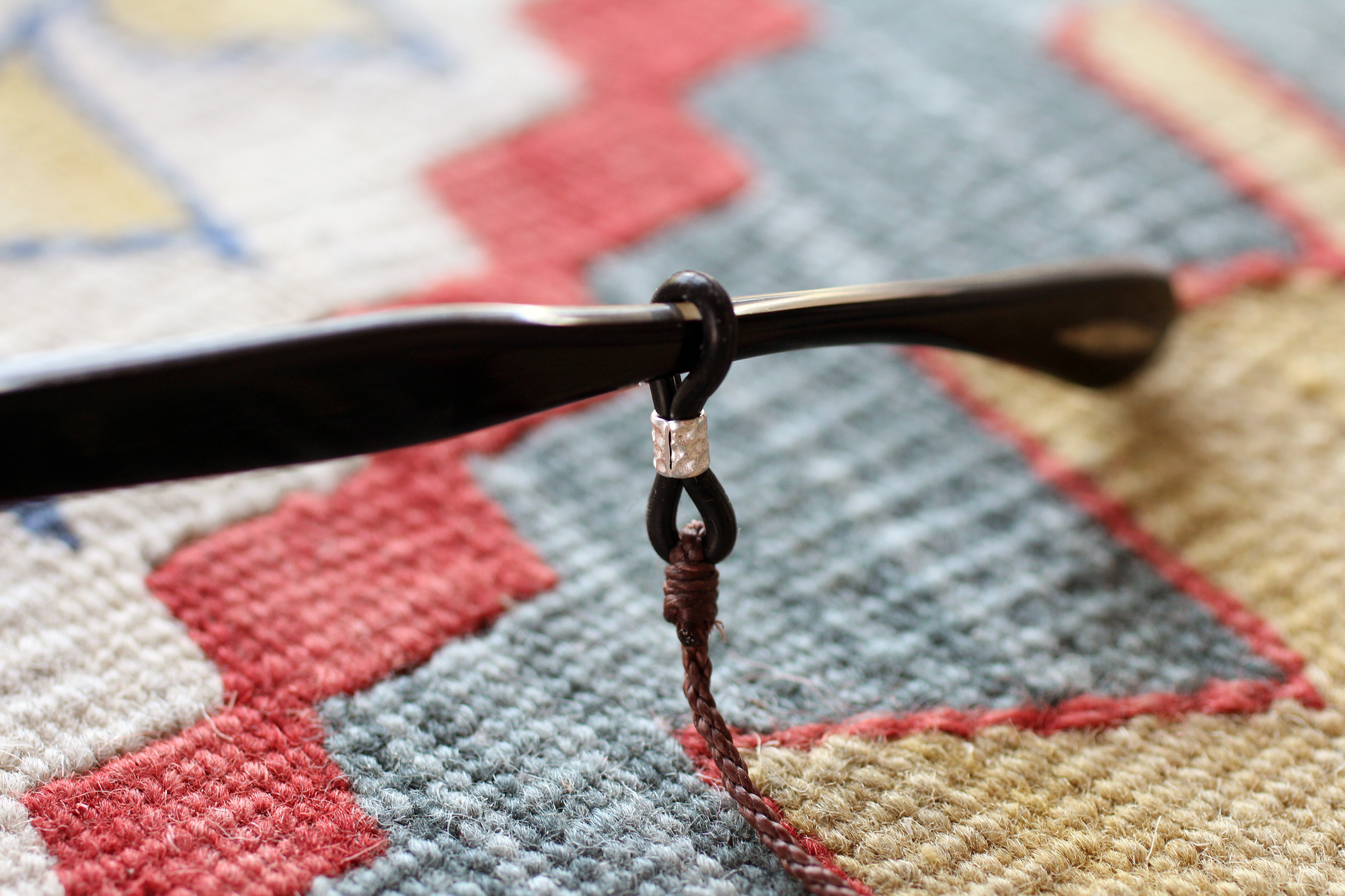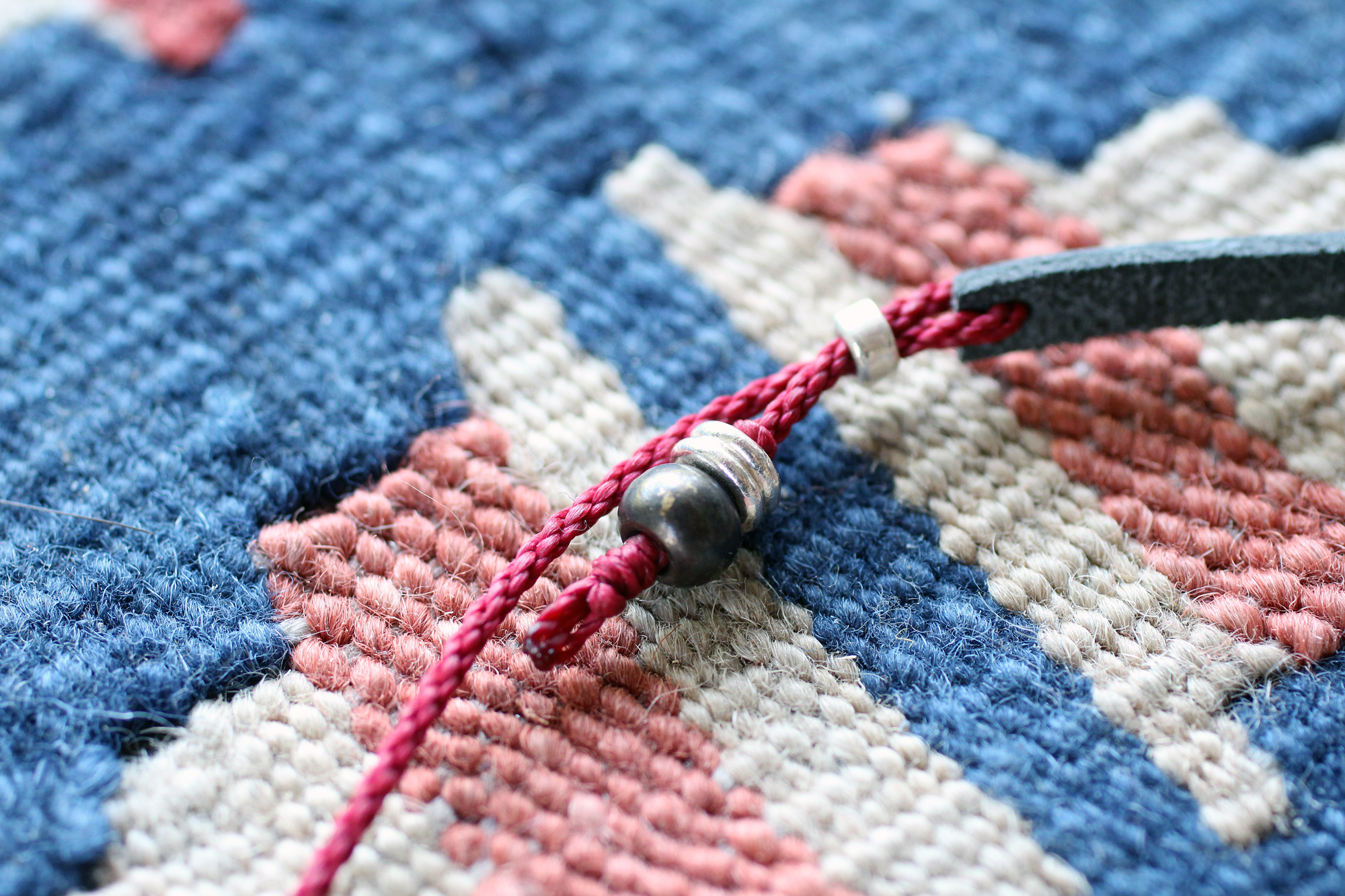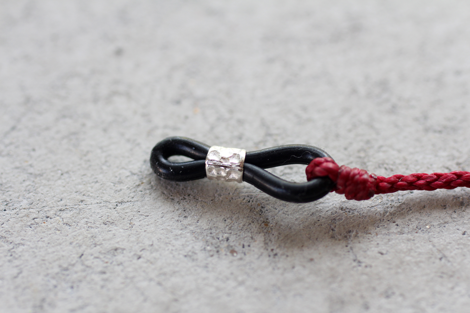ゴム部分の金具は従来の物を取り外し打ち込みのシルバーに変更し、先端部分には燻した真鍮ボールとシルバーを付け、着用感に重みが出るようにしています。