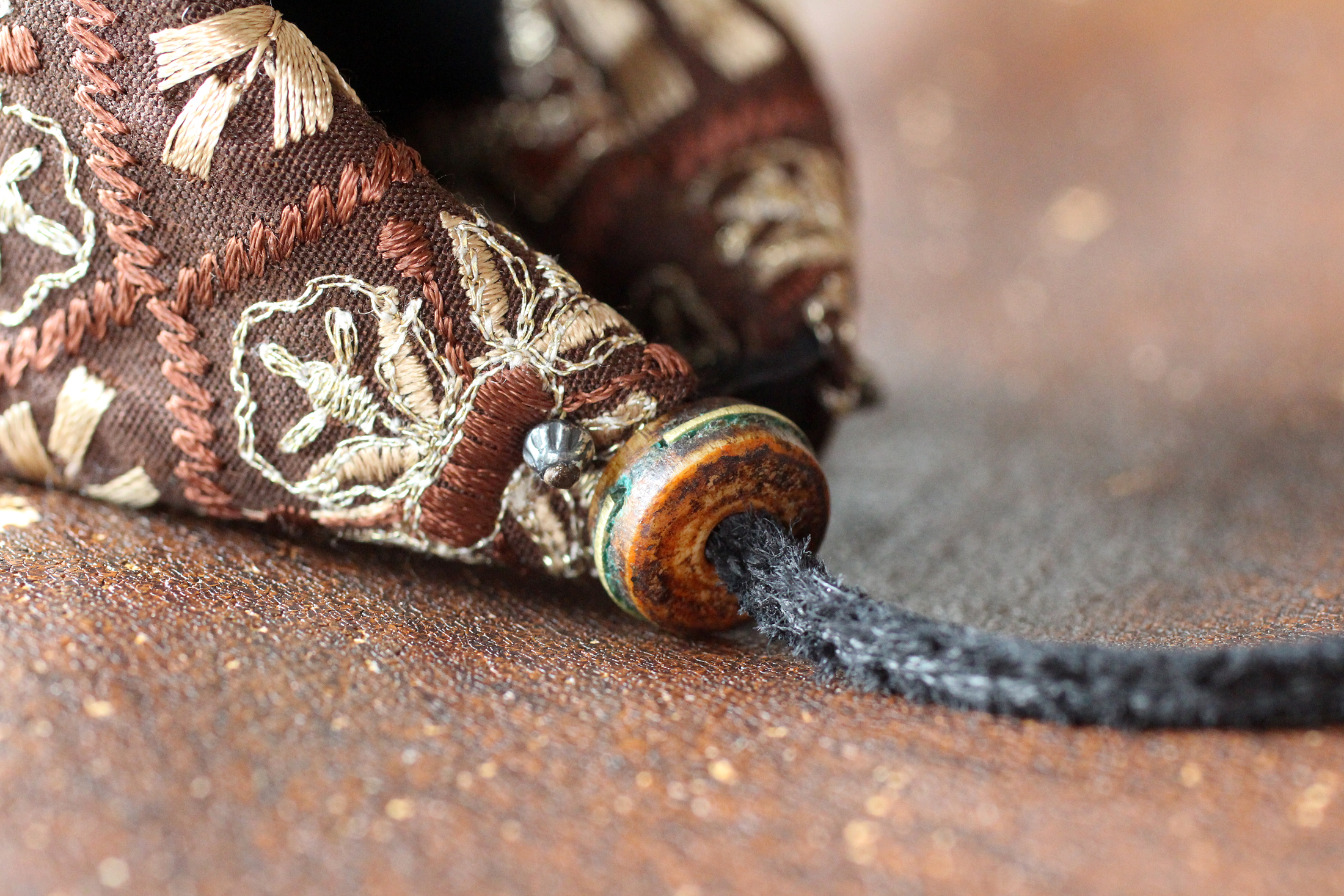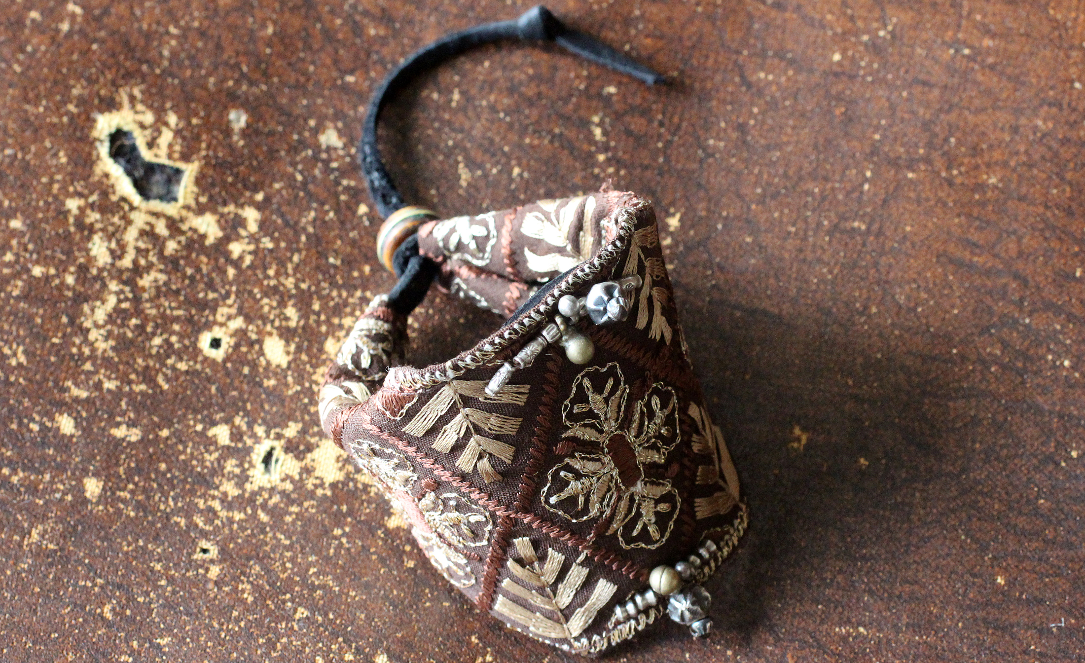 インパクトのある刺繍なので、装飾はなるべくシンプルに、山岳民族のシルバーと打ち込みされたパキスタンのヴィンテージシルバーボール、アフガンベルを繋げています。