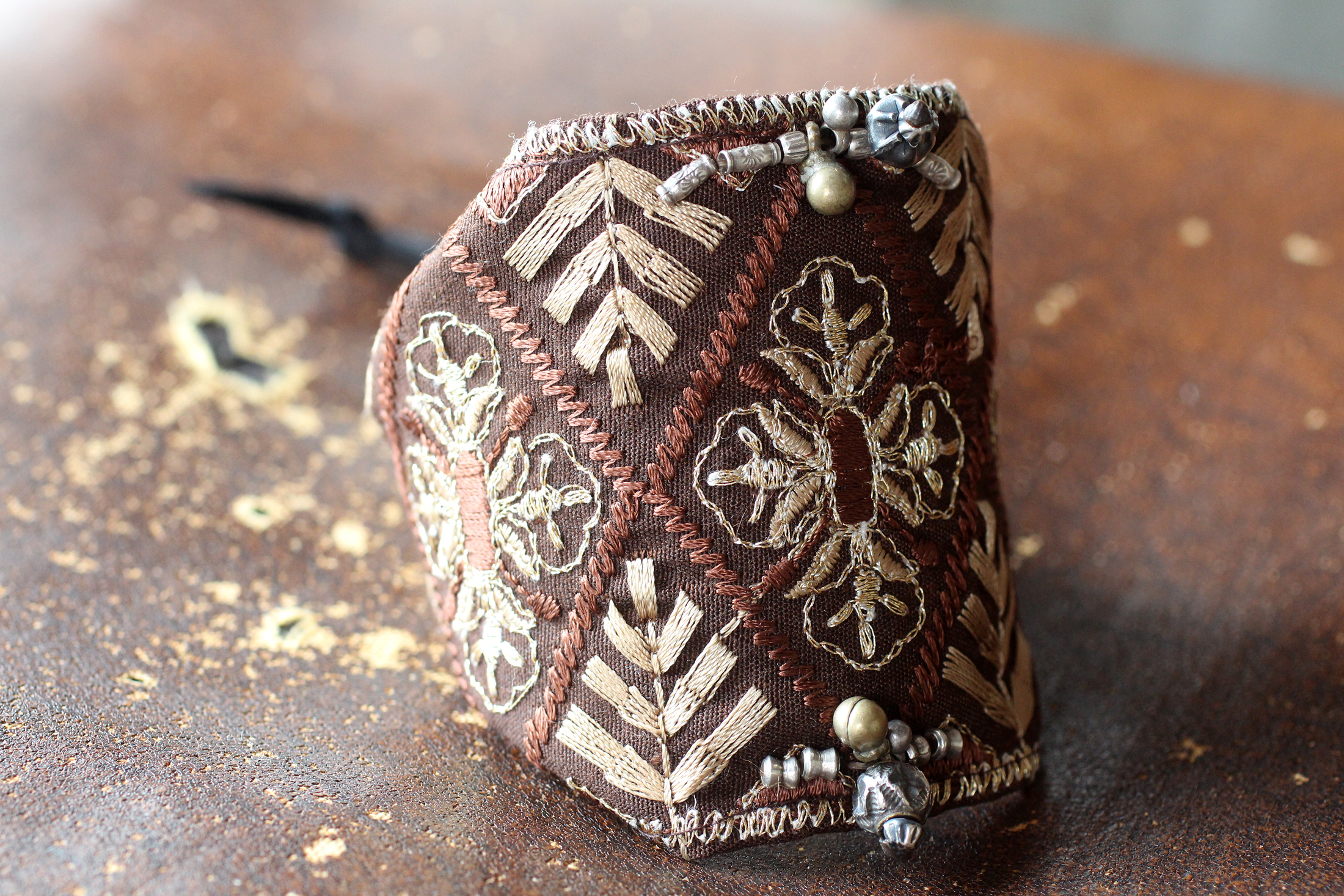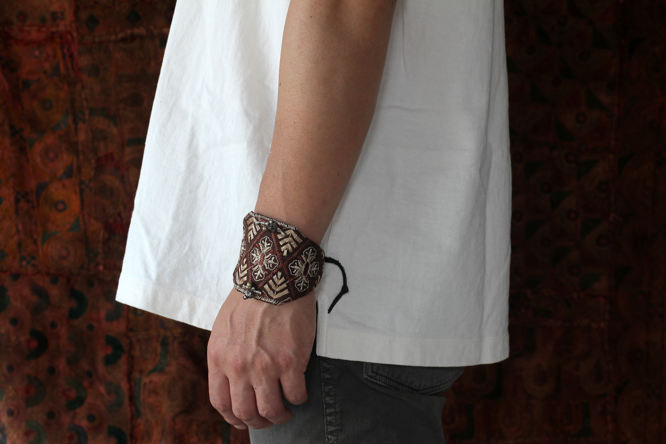 インドを旅していると様々な刺繍された布地、テープ、衣類に出会います。今回はそんな旅の途中で見つけた古いインドの刺繍テープを使い、レザーのコンビーネーションのブレスレットを作りました。インドではサリーの裾に付けるテープとして使用されてきた物になります。