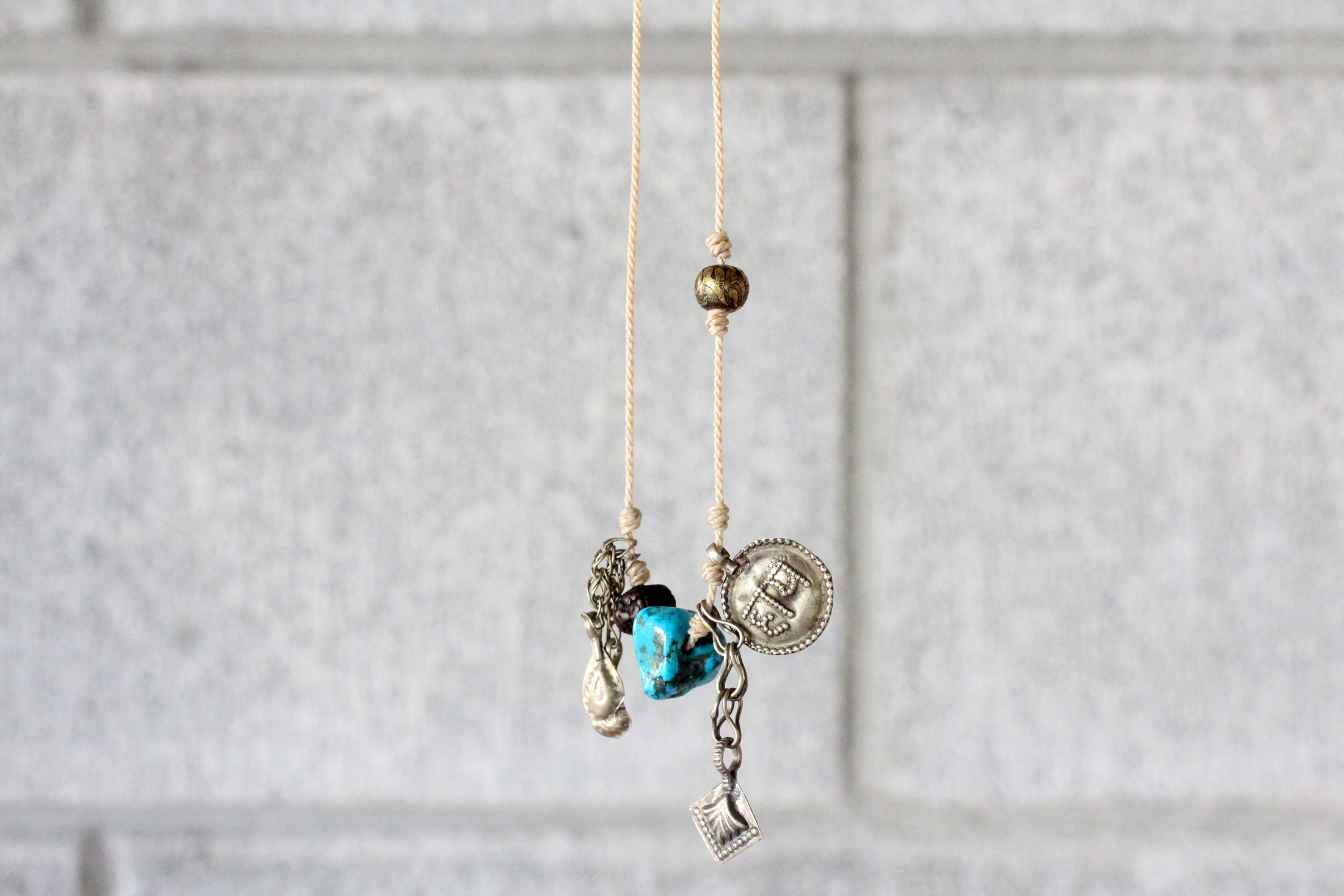 アメリカのキングマン鉱山で採掘された大ぶりなキングマンターコイズを中心に、アフガニスタンのチェーン付きオーナメント、インドのメタルプレート、チベットのゴールド色の合金ボール、ネパールの菩提樹の実を組み合わせました。