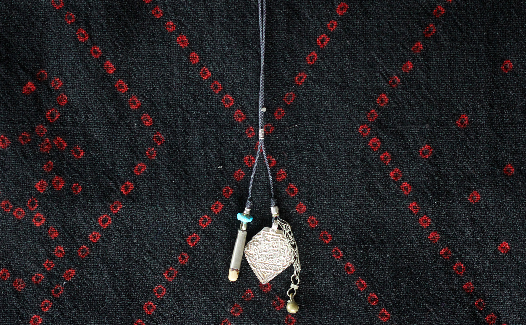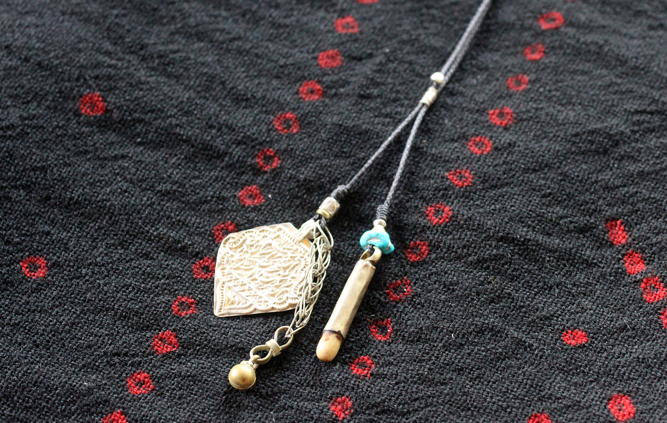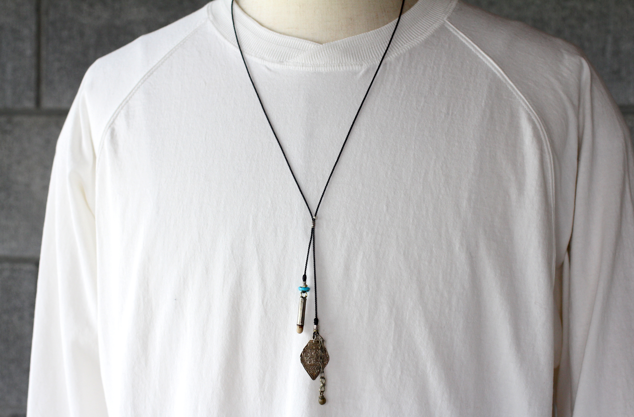 片方には、ヴィンテージのパキスタンのシルバープレート。アラビア文字が打ち込まれたそのプレートは独特の雰囲気を持っています。このプレートにアフガニスタンのオーナメントが取り出した錫製のベル付きチェーンを組み合わせました。