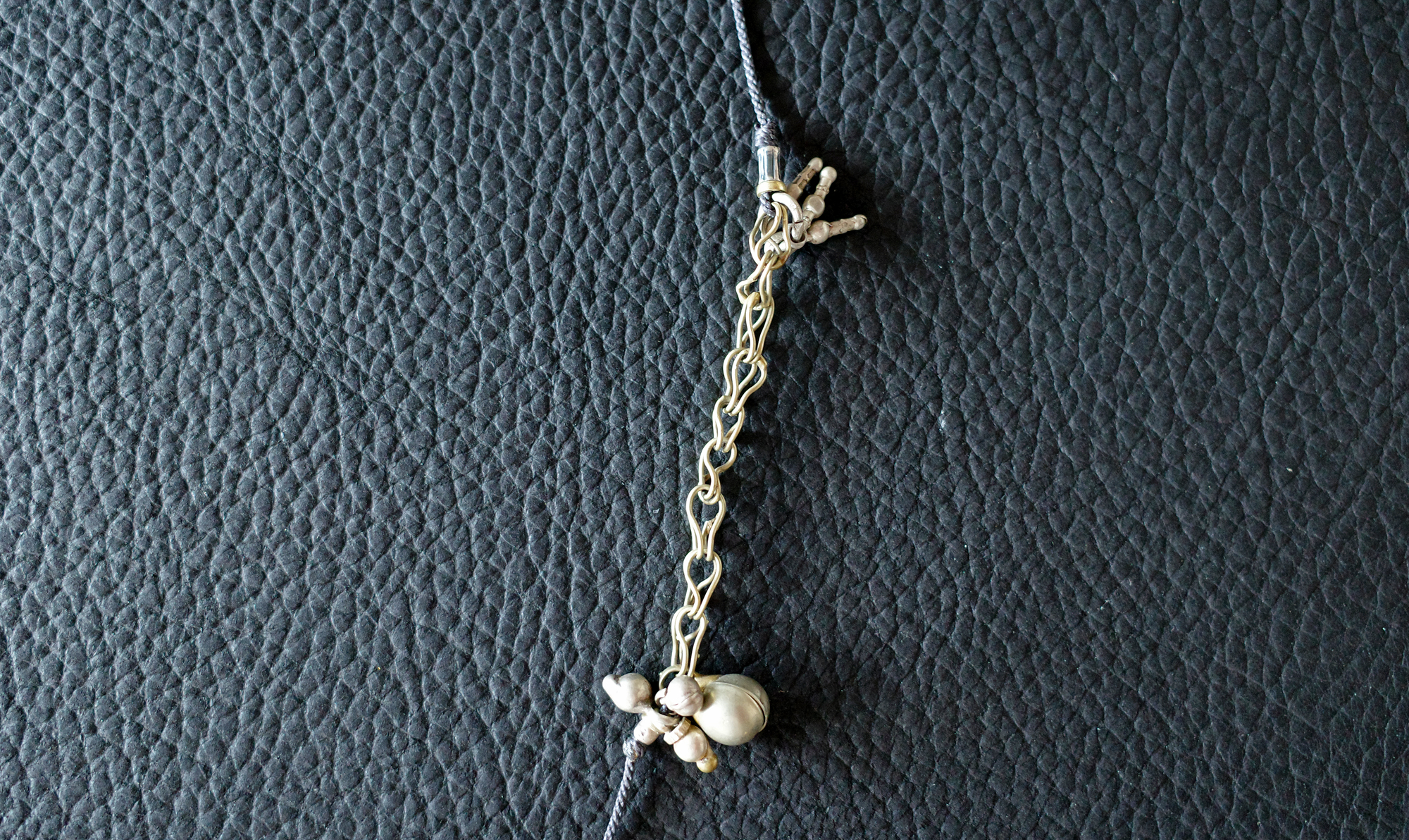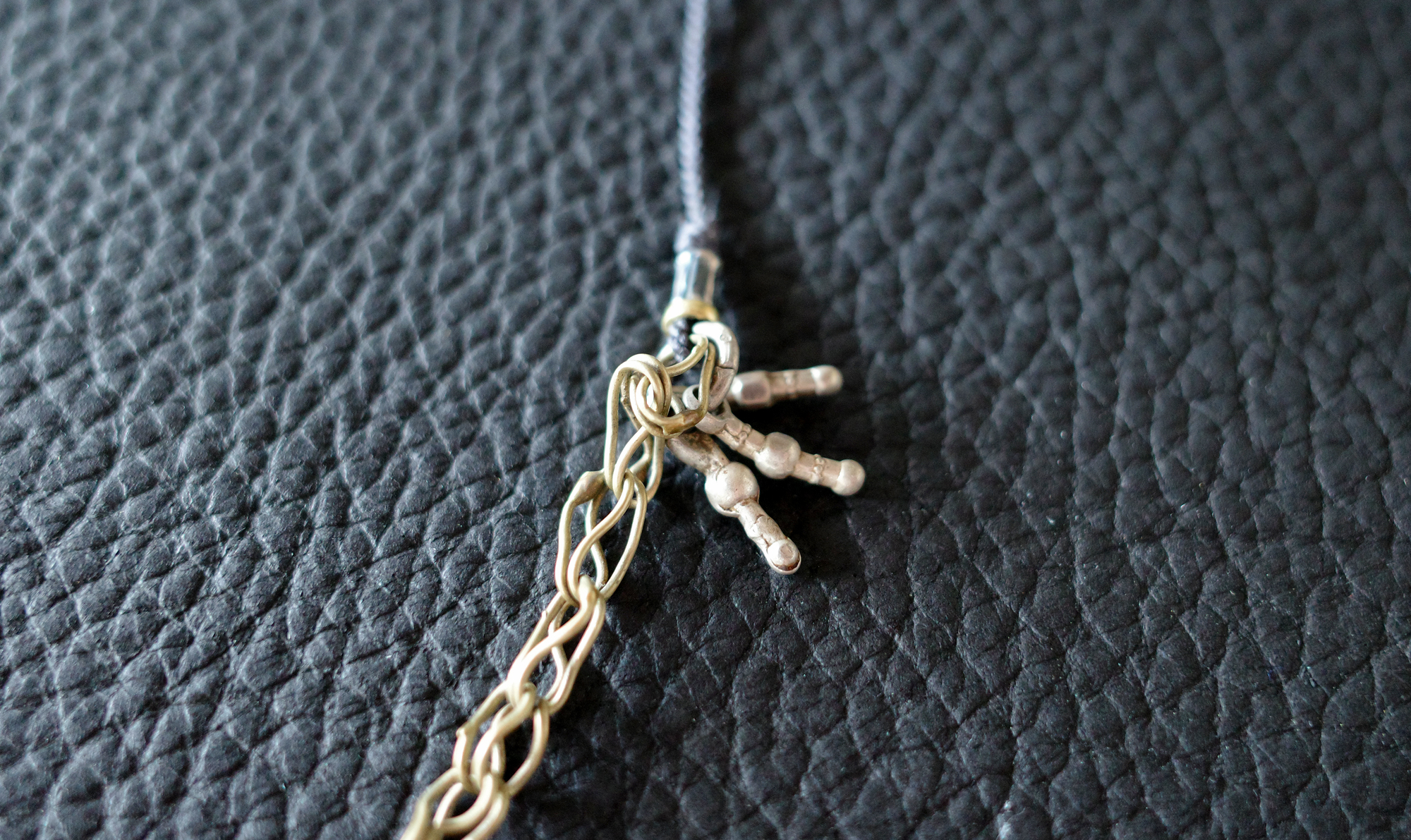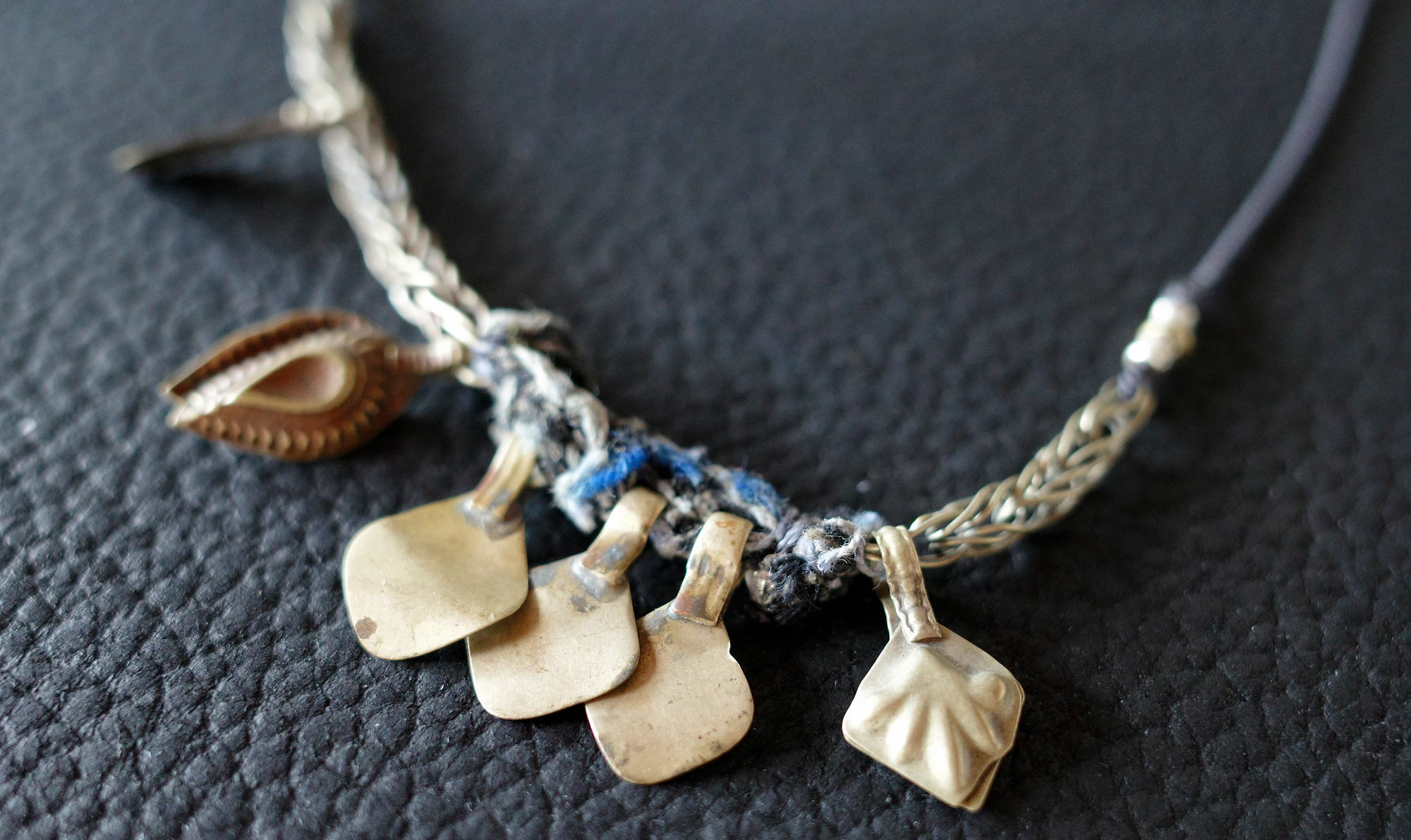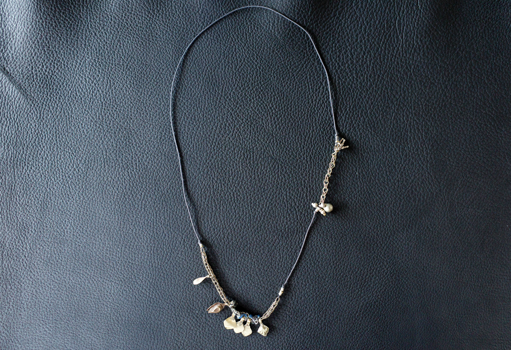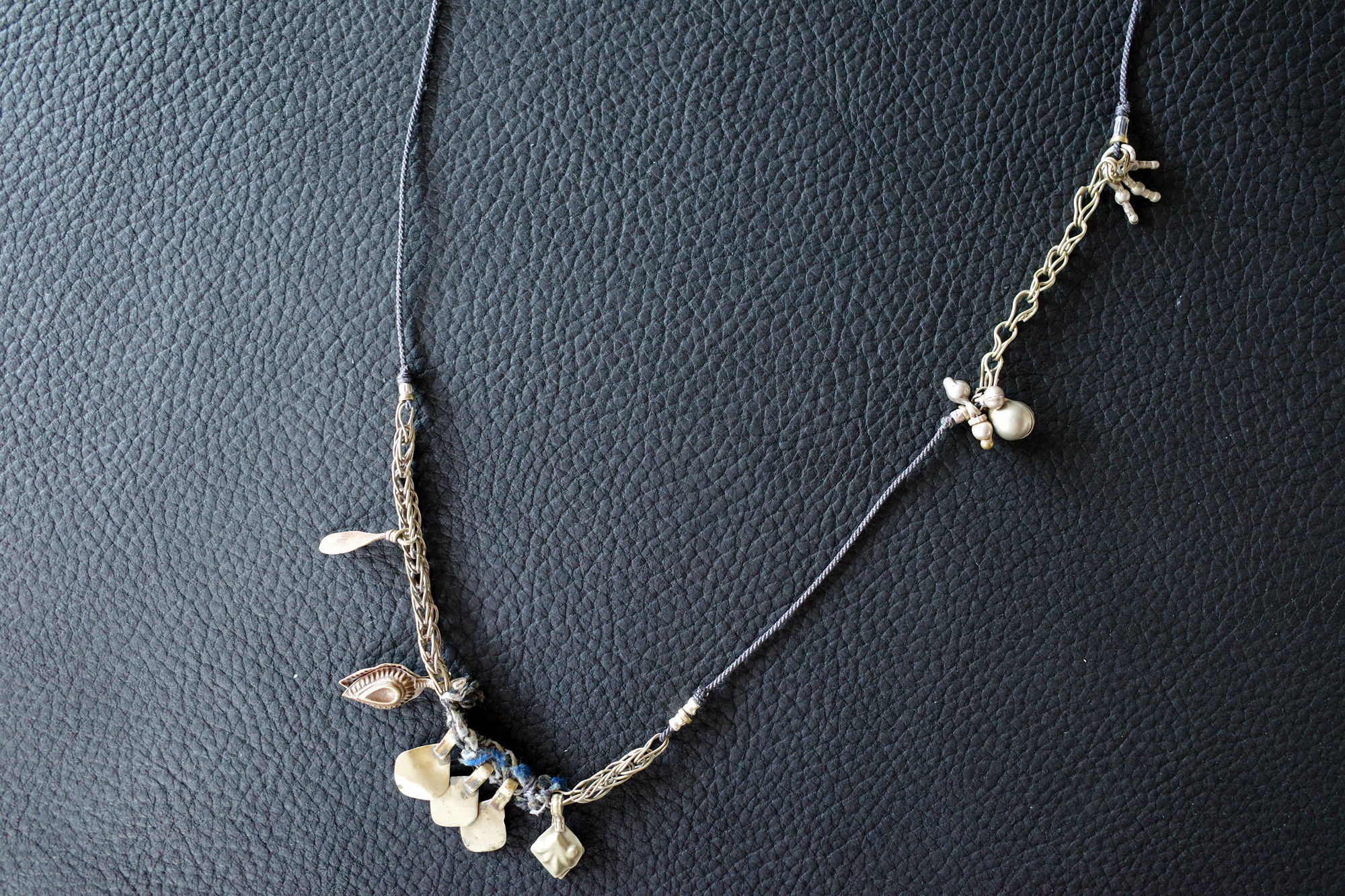 アフガニスタンのオーナメントから取り出したホワイトメタルのパーツをメインに、同チェーンや、元々付いていた布をそのままに繋げています。